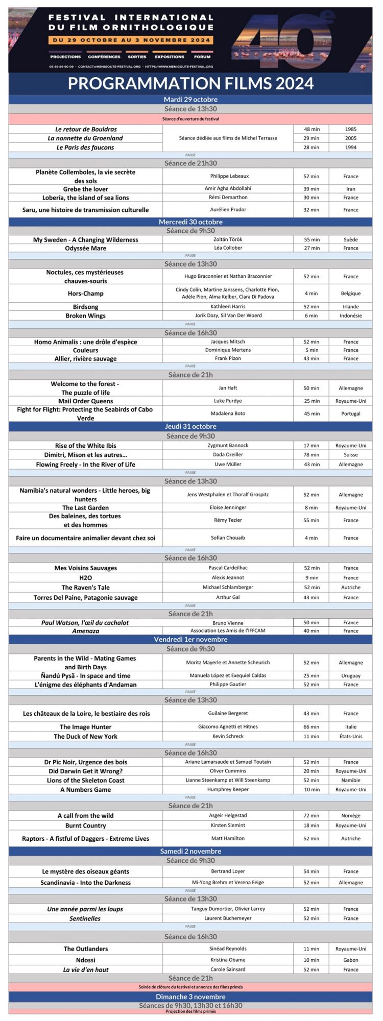 Pour son année anniversaire, le festival a permis de retrouver des films engagés et pleins de générosité, avec une sélection de films particulièrement intergénérationnelle. Ces générations de réalisateurs et réalisatrices qui se croisent et s'apprennent les uns les autres, vont tous vers ce même but, construire le cinéma animalier d'aujourd'hui et de demain. L'on pouvait alors découvrir des passions pour la nature sauvage à travers 44 documentaires issus de 17 nationalités.