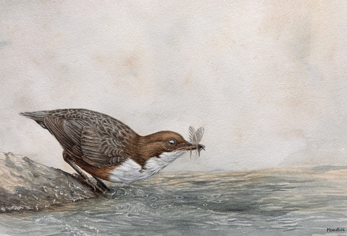 Depuis qu'elle a quitté sa vie parisienne en tant qu’enseignante en arts plastiques, Meuchtilde ne cesse de s'intéresser de plus près aux êtres vivants qui l’entourent. Installée dans les Cévennes lozériennes, elle développe sa pratique du dessin, puis de l’aquarelle en observant les oiseaux, les plantes et les insectes de son jardin. Ses portraits réalistes, peints à taille réelle, donnent vie aux espèces dont elle s’émerveille, tout en rendant hommage à l’esthétique naturaliste classique qu’elle affectionne particulièrement.